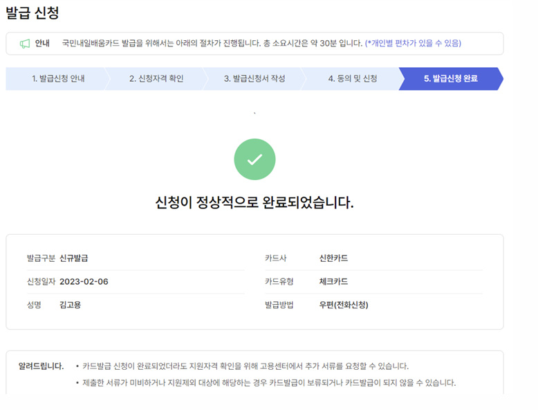 ① 회원가입 → ② 훈련과정 검색 → ③ 국민내일배움카드 신청 → ④ 온라인 상담 또는 오프라인 방문 → ⑤ 발급 완료 순서로 진행됩니다. 보통 7일 이내에 카드 발급이 완료되며, 이후 원하는 교육과정에 바로 등록이 가능합니다.